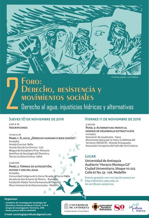 El Semillero de Sociología del Derecho y Teorías Jurídicas Críticas de la Universidad de Antioquia, el Nodo Justicia Hídrica de Medellín, y el grupo de investigación Territorio de la Universidad Pontificia Bolivariana, invitan al Segundo Foro Derecho, Resistencia y Movimientos Sociales sobre “Derecho al agua, injusticias hídricas y alternativas” los días 10 y 11 de noviembre de 2016 en la Universidad de Antioquia. Este foro busca promover un diálogo entre la academia y diferentes actores sociales con el fin de compartir experiencias y reflexiones que puedan abrir horizontes de esperanza para el fortalecimiento de la justicia hídrica.